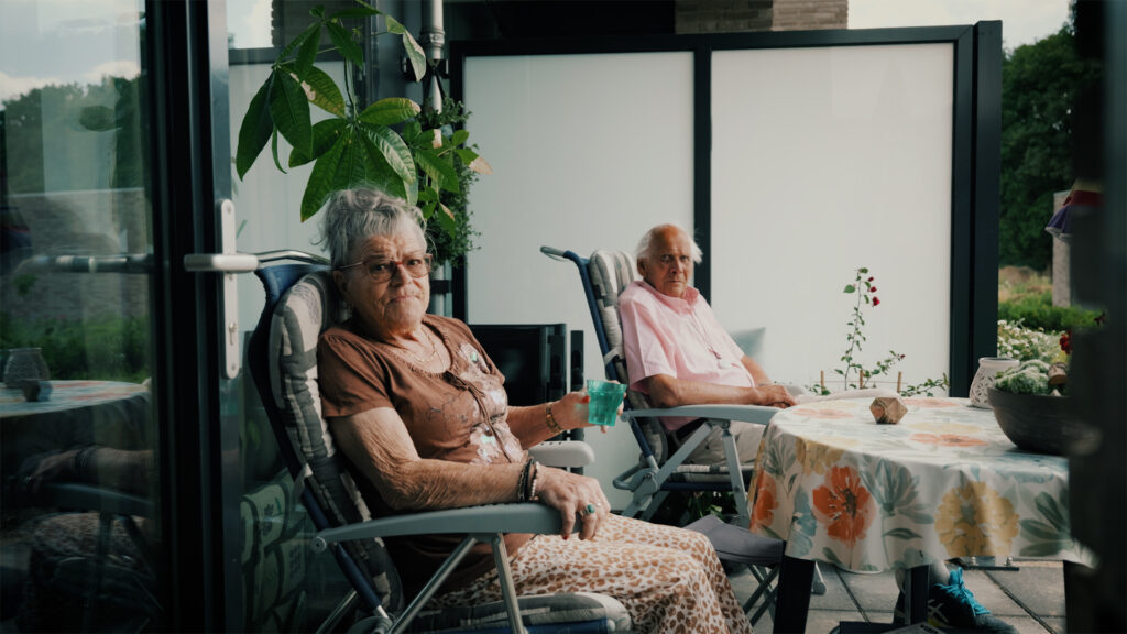 Ook buiten, op hun eigen terras, voelt het als een fijne en levendige plek. Vanaf hun terras zien ze de tuin, het groen en voorbijgangers die fietsen of wandelen. “We willen niet ergens in een hoekje zitten,” zegt Rice. “We willen gewoon lekker mensen zien.” De omgeving geeft hen rust, overzicht en een gevoel van verbondenheid met de natuur.
